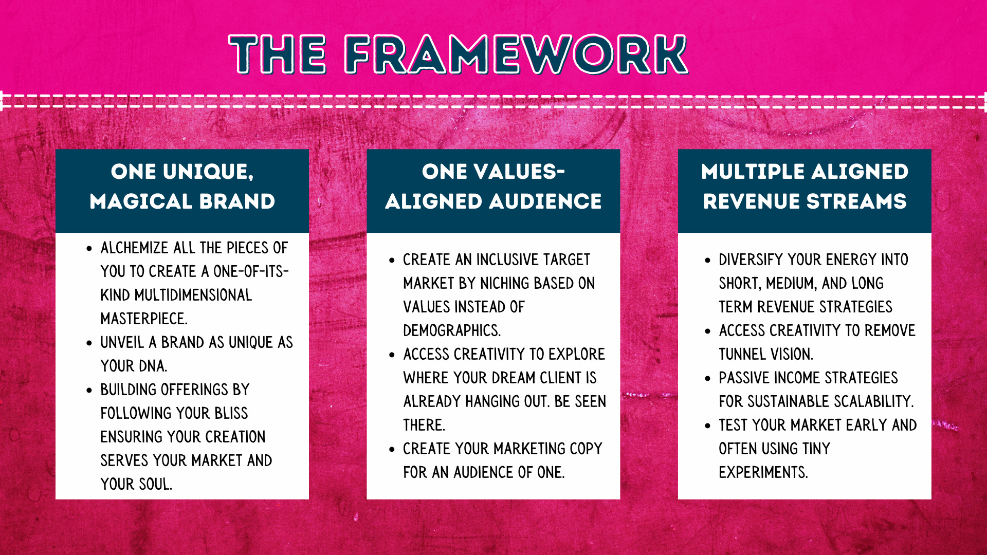 In lieu of a formula, I created a framework for supporting the conscious creator to use their unique magic. It includes scooping up all the fragmented pieces of their identity, even the bits that feel unpleasant now, and adding them to the magical potion that is your unique brand. The framework is not a formula, it’s just a gentle container for ensuring that we are following a structure that is aligned with our values, needs, and desires.